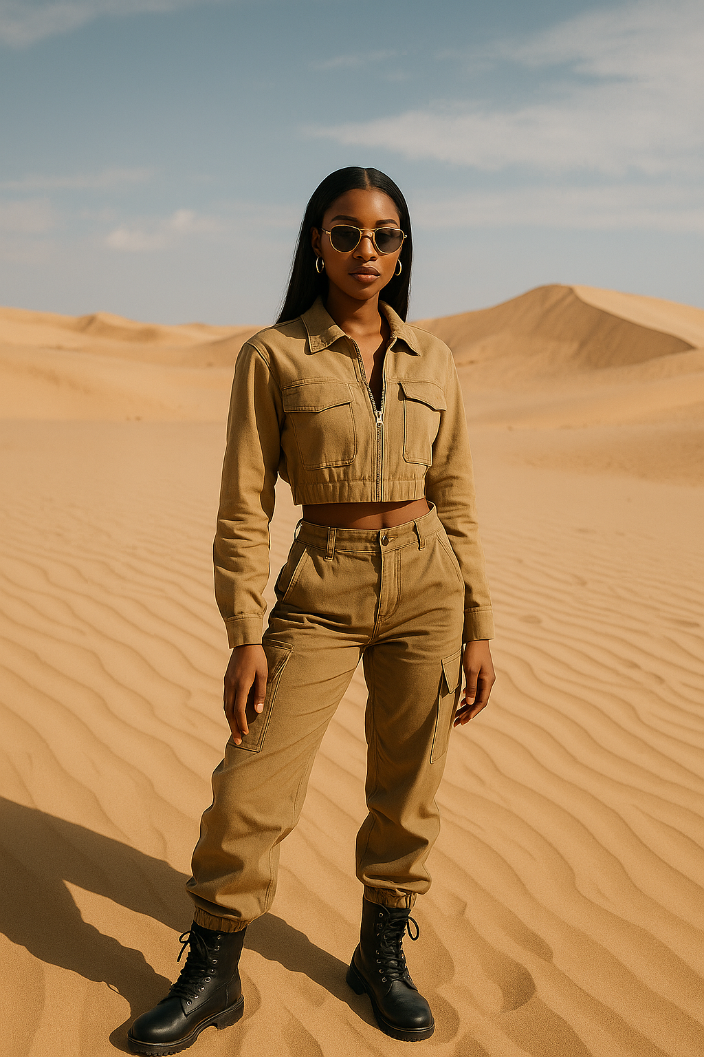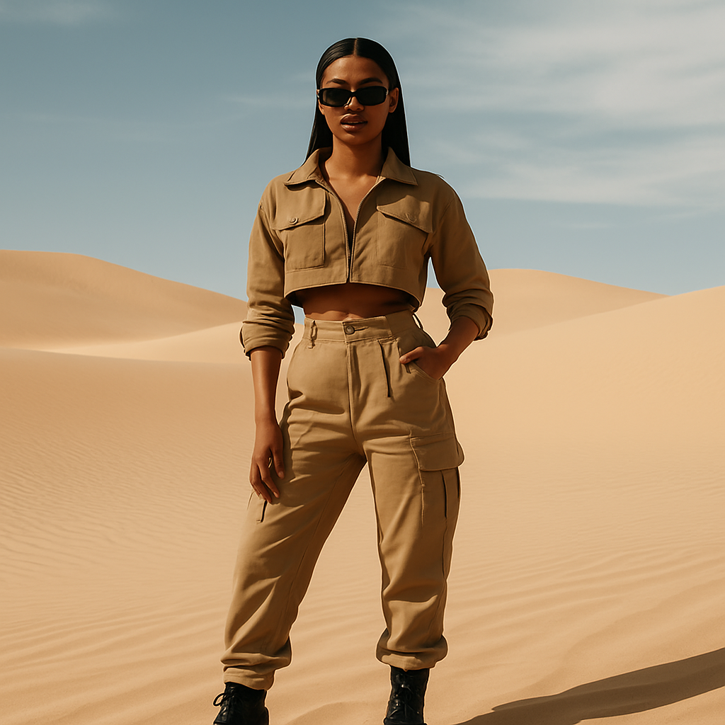 Street-luxe looks styled against golden desert dunes, capturing bold individuality and fearless fashion.