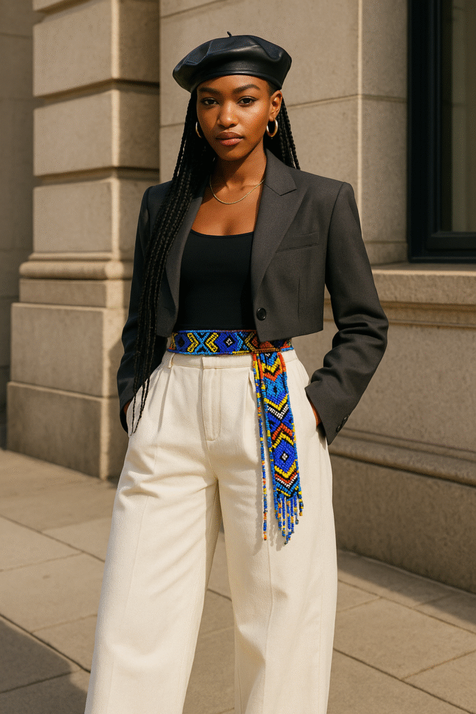 She pairs cream barrel pants with a Zulu-inspired beaded belt or scarf sash. The mix honors tradition while keeping the look contemporary.